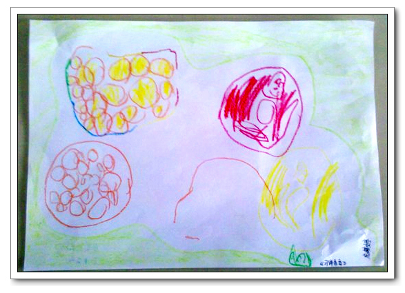 婆婆买了各种各样的水果一堆,宝宝特别喜欢的还是月饼。这是我从老师的相册里down下来的宝宝画得月饼,品种很多,据说有橙子月饼、苹果月饼、鸡蛋月饼、草莓月饼,下面那个小小的绿色的,是绿茶月饼。
