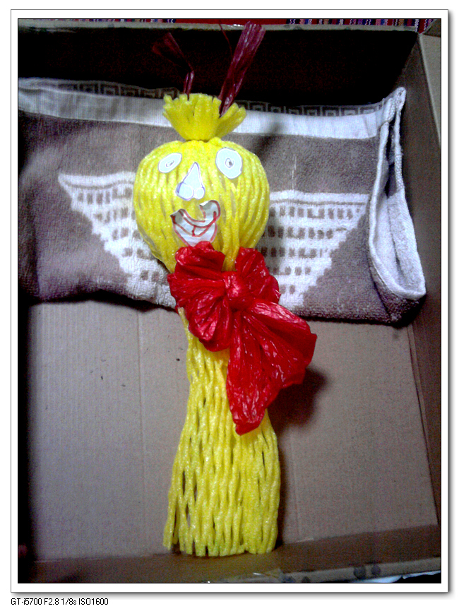 将环保进行到底,连身上的被子都是塑料袋,完全的废物利用啊。这个丑娃娃宝宝很玩了一会儿过家家,可惜后来在跟我抢这照顾它的过程中把头给撕破了,才不得不扔掉,呵呵。