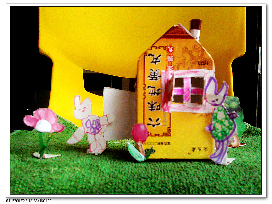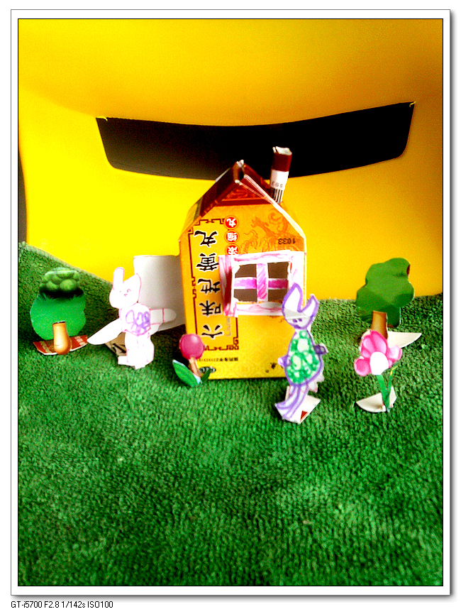 光个房子有什么好看?可是家里宣传页没了,正好看到宝宝吃的蘑菇力,把盒子拆开,蘑菇把当了树干,草地当了树冠,小姑娘的袖子变成了小花。再铺上一块绿色的毛巾,毛茸茸的碧草地,是不是也有点小剧场的感觉?宝宝,快请你的小兔子来演戏吧。