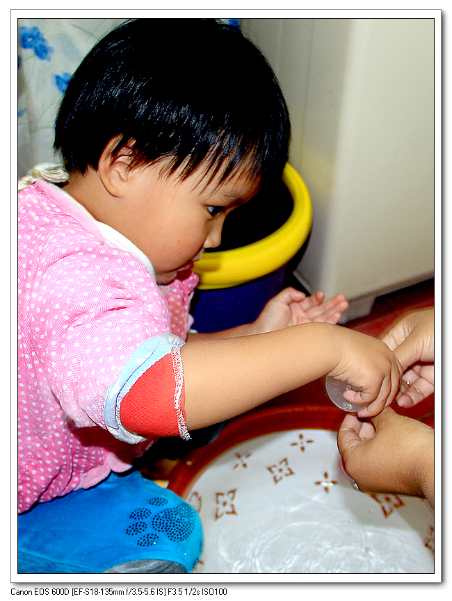 宝宝特别喜欢这个游戏,乐此不疲。幸好我给她穿了兜兜能防点水,不过就这样,我们俩身上还是免不了被溅了不少水,没办法,这个小坏蛋,看到水溅到人身上,就开心得不得了。拽她出浴室的时候,是那样的心不甘情不愿,用讲故事的借口,才把她叫出来,她还把气球藏到了枕头边,这样,下次玩的时候,很容易就能找到了。