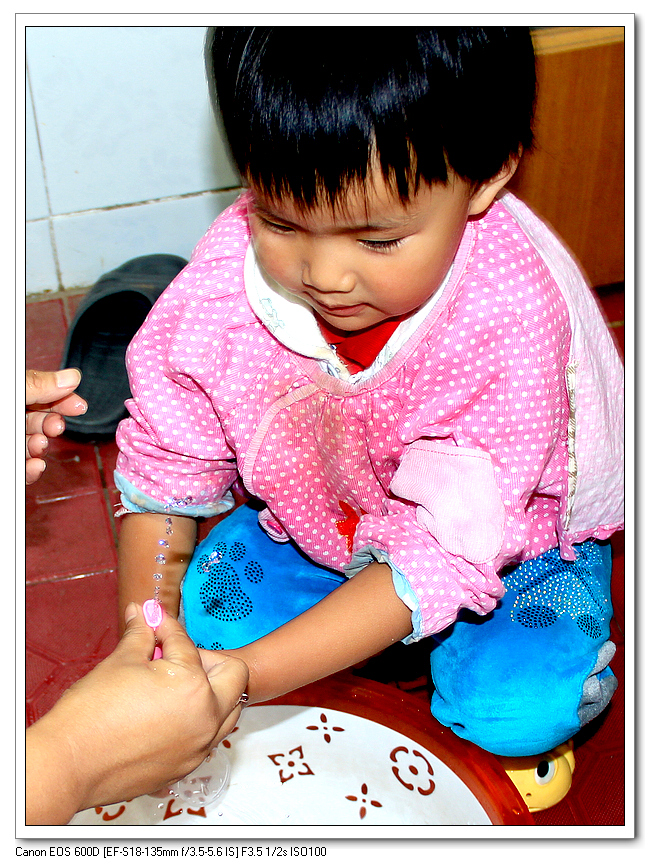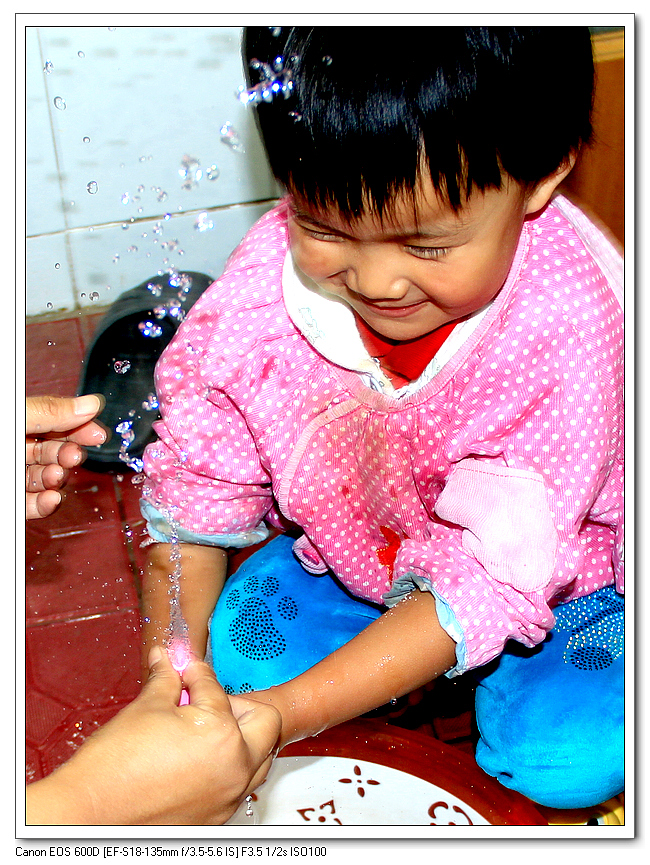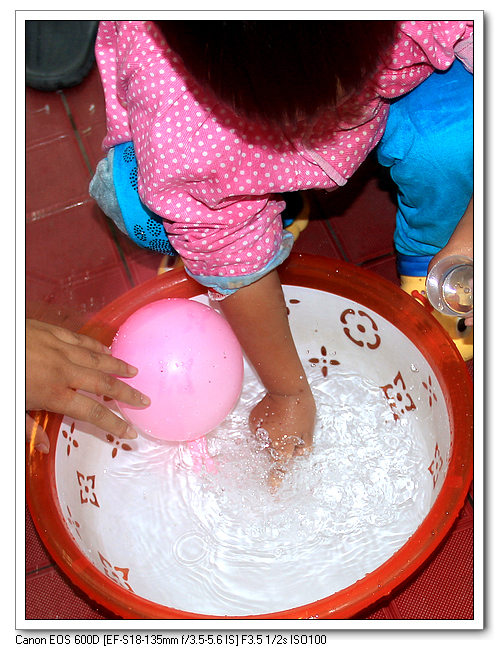 我突然想到了喷泉,一跟她说,她就道,这是个好主意(哈哈,这是宝宝的口头禅)。我跟她一起灌好水,然后捏紧气球口,让宝宝挤压气球。并让她观察喷泉的高度。
