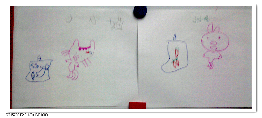 画的小小兔和它的好朋友小小猫,这是宝宝第一次这样子画身体,上身形态完整,笔法熟练。左面小猫的塑料袋外形很漂亮,右边的胡萝卜形状和颜色都不错。塑料袋还特意画出了拎的把手,观察力细致。“小”字是自己写的,“兔”和“猫”字,是在我妈的指导下写出来的。