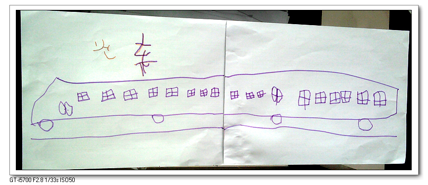 长长的火车,字是在我妈的指导下写的。火车跑在铁轨上,还说,铁轨只能看见这边,另一边挡住了,看不到。还能看出哪边是火车头。