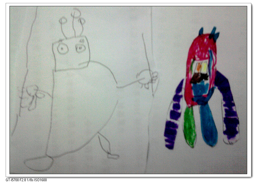这是我非常喜欢的机器人和火箭。机器人方方的脑袋,头上有三根天线,火箭里面还有仪器。火箭画得很让我惊艳,毕竟不是常见的东西,要靠孩子的想象力。单纯线条的时候,可以看出挺复杂的,涂上颜色后掩盖了一些线条,增加了一丝活泼。