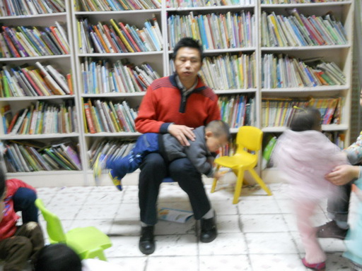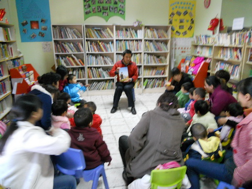 接下来是讲故事环节了。今天要讲的故事是《爷爷一定有办法》。棉花糖叔叔拿到书的时候同小朋友们介绍这是爷爷,这是约瑟,便有小朋友们不由自主的上前去给大家指哪个是爷爷,哪个是约瑟。随后棉花糖叔叔当翻开扉页的时候,大家看到了那块蓝色的布,可是当时大家都没有意识到这是一块布,而大多数都说是天空上的星星。其中有一个穿粉衣服的小女孩居然在那里独自唱起来。这个绘本是那种重复性语言的绘本,侧重于小约瑟的“不要扔、不要扔,爷爷一定有办法”,让大家明白爷爷的智慧和心灵手巧,后面还有一段“爷爷用剪子咔嚓咔嚓剪,用针缝过来,缝过去”是象声词和动作的结合,很有互动性,这两段都是可以让孩子们自己说出来的语句,经过棉花糖叔叔的提醒和启示,有小朋友和家长已能自己说出来,说明他们已经领悟并明白作者的意思了。另外,这虽然是一本书,却讲了两个故事,人类的一家和小老鼠的一家,分别出现在图的上下两层,棉花糖叔叔给小朋友们和家长提示了一下这个细节,鼓励他们自己借回去发现更多有趣的东西。