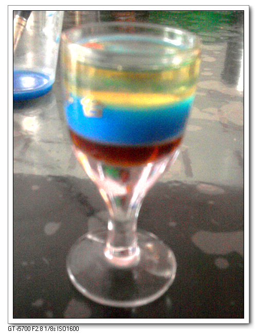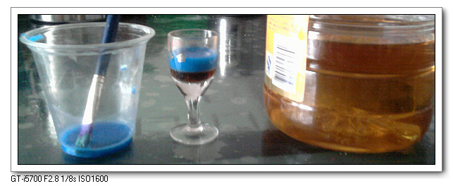 没有糖浆,想着蜂蜜肯定也行;结果连蜂蜜也吃光了,好在还有秋梨膏。颜色选用了蓝色,主要考虑红色的和秋梨膏类似,怕效果不好。一直担心广告色太重,会影响实验效果,还好,一个多小时后,颜色才渗入秋梨膏。最上层的,自然是食用油。我本来想试试家里的苹果醋的,估计应该也能成功。