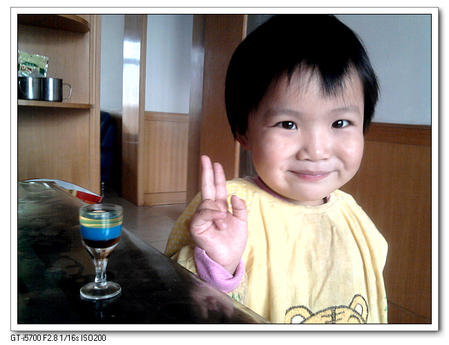 做出来的成品还不错,挺漂亮的。给婷讲了一下道理,婷很快就能记住——秋梨膏最重,在最下面;颜料水不轻不重,在中间;油最轻,在最上面。