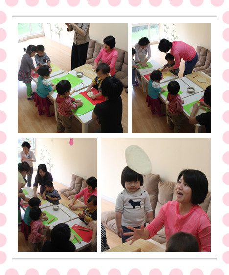 故事会结束,我们一起为妈妈们准备美味的pizza大餐吧!开始揉面咯~~开开妈妈好厉害,既然还会甩饼!