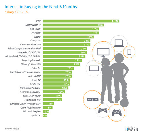 作者:linyan 发布时间:2012-11-21 10:17知名市场研究机构Nielsen今日公布了最新的调查结果,就像去年一样,想在圣诞节期间获得移动设备和游戏主机的人仍然占大多数。年龄在6-12岁的孩子们仍然最希望获得iOS设备,13岁以上人群中最受欢迎的iPad,iPhone也名列前茅。