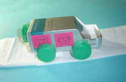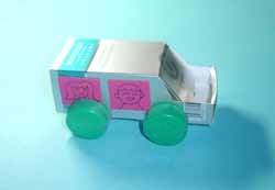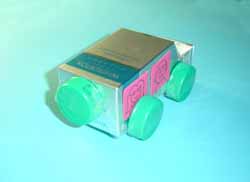 6.把矿泉水瓶盖装到盒体下作轮子,车子的雏形就出来了。