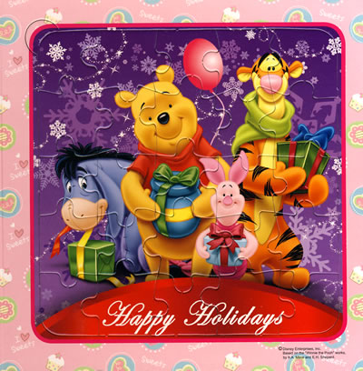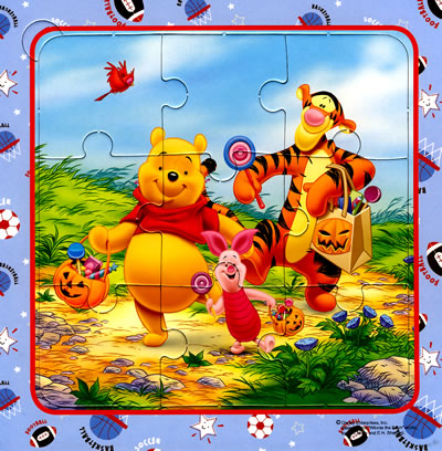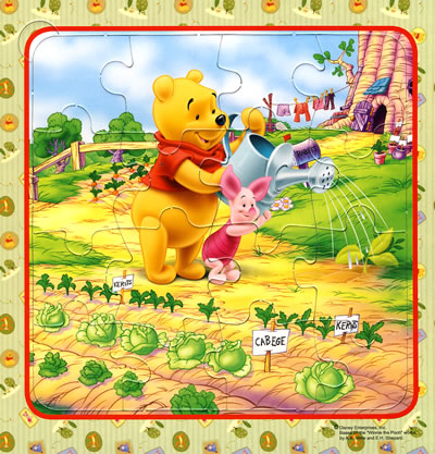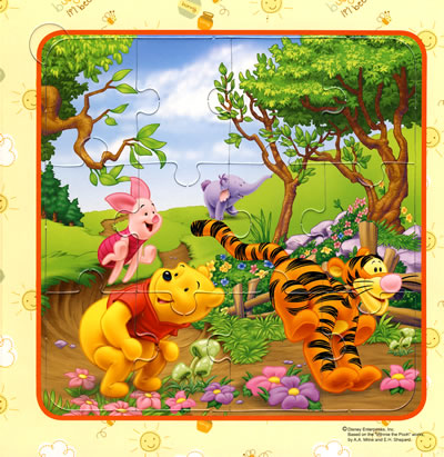 这本拼图书人物形象设计很可爱,迪士尼动画里的维尼小熊、跳跳虎、小猪、小驴屹耳深得女儿的喜爱。一本书中共包括6、9、12、16、25块难度递增的6张拼图。