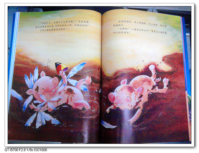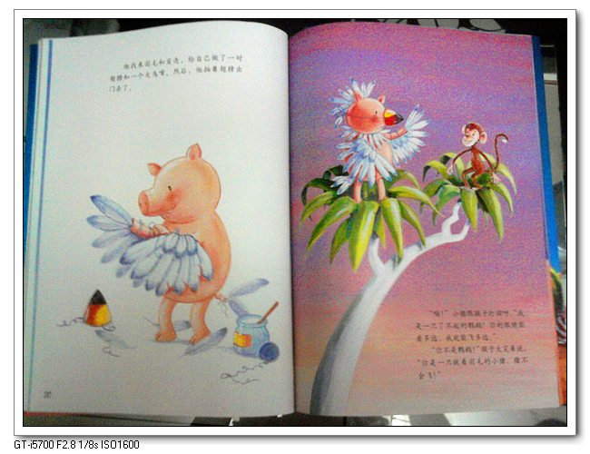 但是婷才3岁,她恐怕还理解不了如此深的内涵。而我喜欢这本绘本,也不仅仅是因为它蕴含的深厚道理。我喜欢的,是里面那只可爱的,会玩的,满脑子奇思异想,极有想象力的小猪,而且它不怕挫折,不怕嘲笑,屡败屡战,执着地寻找着快乐。