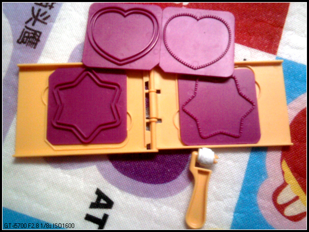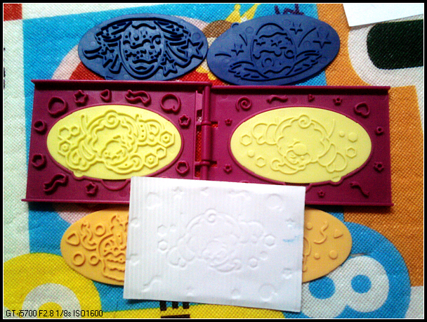 这个盒子,配了3块模板,放入压纸器下面那个槽,过一下,可以压出不同的花纹(蛋糕、礼花什么的)。