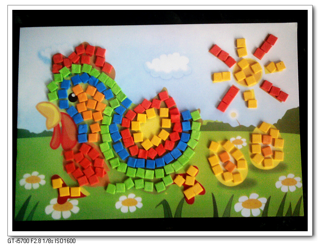这个东西的正确名称我也不知道叫什么,好像就是叫马赛克贴画,因为它是一小块一小块的彩色EVA块,背面有贴纸。适合3岁半以上的孩子玩,一个是这个时候孩子的精细动作可以了,能够自己把那么小的贴纸揭开;一个是孩子大了后,专注力有了,可以独立完成作品。