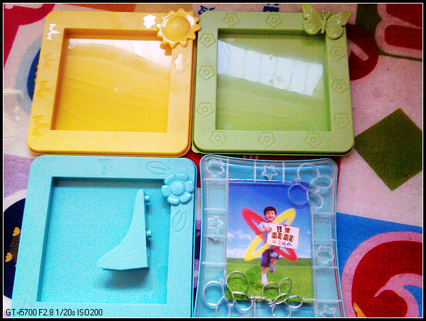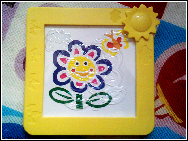 随彩泥配送了4个相框,还有4张彩色的纸和透明塑料膜。塑料膜上有压纹,可以参考配送的图片色彩,制作出漂亮的画来(里面有一幅“我爱妈妈”,这个打动了我的钱包)。图片背后则是简单漂亮的背景图片,可以衬托出效果(可惜我给忘记拍了)。这个创意真棒,没在其他的彩泥上见过。