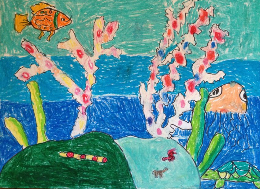 女儿4岁多的画,我最喜欢这里面那条鱼,眼神很有趣。这个画是在少年宫画的,每次都要画2节课,第一届画线,第二节课填图。