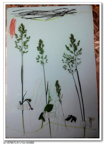 婷采了些野草回来,本是想着让她在纸上贴个花瓶,当作插花,婷却说要做小树林,弄了个这出来。下面是兔子和婷,在捉迷藏,顶端的黑色表示是黑夜。
