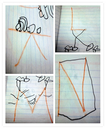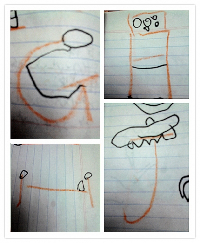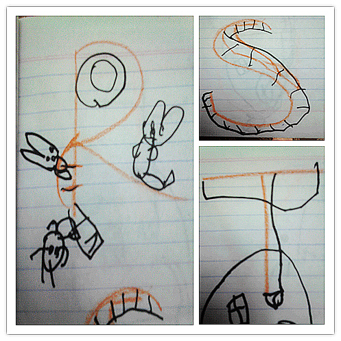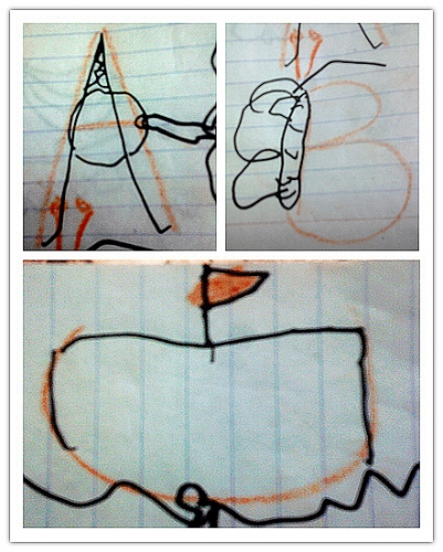 前天晚上,跟婷坐在沙发上玩儿。婷找到一个旧红旗本,让我跟她把每页都标上数字。标完后,我信手写了A,让婷看像什么,婷说像夹子;于是随手写了B、C、D……写了G出来,我刚说了句这个有点难,婷道,这像个凳子,后面有灯,真是让人惊艳的联想。于是把26个字母逐一写了出来,让婷说并把她说得画出来,颇有几个不错的创意。一气呵成,不多思考,颠倒旋转,想到画到。
