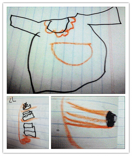 D是衣服的口袋,衣服领子上还有花边;E是书柜;F是牙刷,上面的牙膏是黑色的,我现编了一个鞋油抹到牙膏上的故事,逗得婷哈哈大笑;(DEF都是她自己写的,E写的下面通出来了,于是她涂了个蛋蛋,看起来倒像是书柜的轮子)