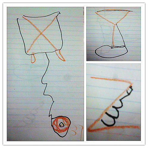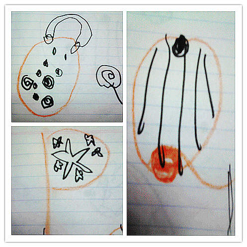 O像糖果包,怕别人看不清楚,还在旁边还特意画了放大版的棒棒糖;P像打乒乓球的球拍,球上面还有漂亮的图案(后来又说是乒乓球粘在棍子上了);Q像气球;