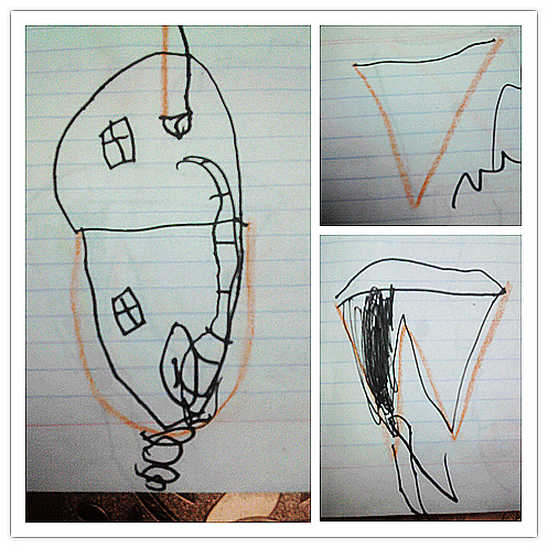 这就是那个让我惊喜的G,是一个小板凳,后面有灯,还能防止人摔倒(现在看挺像一个坐着读书的人);H原来想得是摇椅,下面还画了摇椅的弧形腿,后来又说像冰箱,里面装着食物;I像床,床上有床头和枕头;J像雨伞,雨伞有花边;