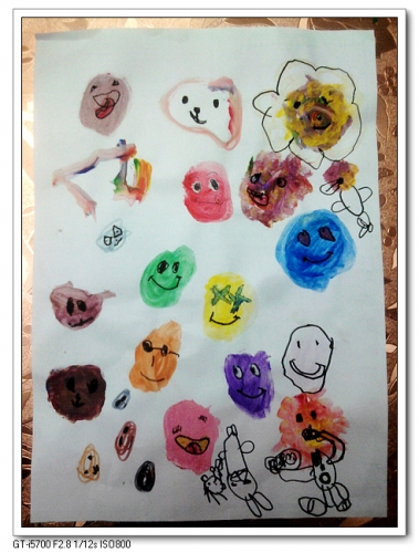 婷的小脸谱。眼白、舌头的颜色是我帮填涂的。下面有婷和婷婷兔在欣赏作品,最下角那个橘色脸的小朋友在刷牙。