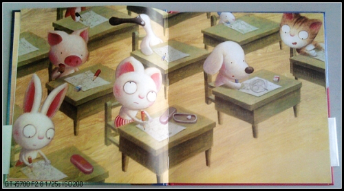 展开封面,橘色的纸面上,一道道考题看得人发晕,短耳兔和她的朋友们围了一个圆圈,表情各异,仔细看看,到底有几个小朋友?(我一开始以为是说孩子们考试压力大就是受了这张图片影响,后来才发现,是7个小朋友出现了4遍,哈哈)知道为什么会围成一圈吗?想想看,像不像一个零分?