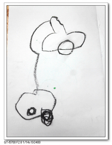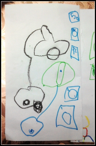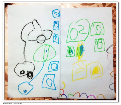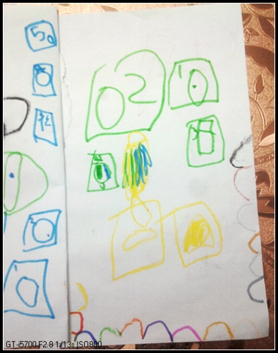 婷翻出了很久以前画的一张画,告诉我这是杂志。我看看,挺有趣,把两张画拼在了一起,比例还有点杂志的感觉。不过最让我欣赏的当然还是那盏台灯,简单形象,观察细微(所以说,对简笔画的兴趣不是很大,让孩子自己观察来的不会拘泥,不是死记硬背)。婷却非要让我欣赏另一页上的彩灯,可是我的欣赏水平实在有限,没看懂啊。