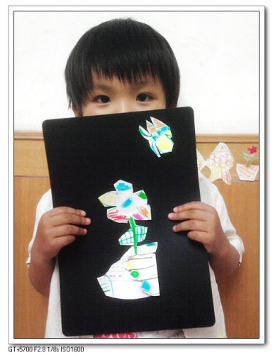 非常简单,先让婷把自己的手放在一张略硬点的纸上,然后描好,还添上了袖口。虽然我们不能真的染指甲,不过可以给纸上的手画漂亮的颜色。剪下来,让手回握,正好握住一束花。花儿太香了,把小蝴蝶都引来了。手、花、蝴蝶有比较多的细节,可以锻炼婷使用剪刀的熟练程度。
