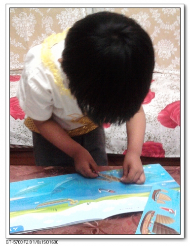这本书比幼儿园的课本略小一点,14页,比较薄。不过书籍和里面的贴纸质量很好,婷可以自己很轻易地取下来,帖错了的时候,也可以撕下来重新粘贴。发帖的时候才发现书的封面写着:“大胆帖,不用怕;反复贴,不易烂”。贴纸的背景是蓝色,映衬大海的主题,有点少见哈,大多是白色的。贴纸是在书的最后,用透明塑料袋封装的,我比较喜欢这种设计。以前买的贴纸书,大多是在书的首页、末页或者内页中装订,不撕下来的话取的时候不方便,撕下来的话如果一页帖不完,容易丢失。而孩子的年龄不同、专注力不同,不一定每次都能帖完一页的。