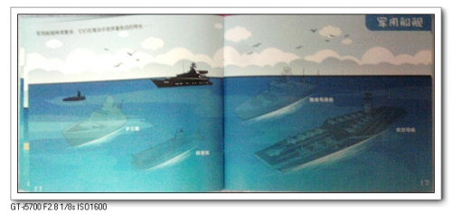 民用船里画的大白鹅船,很熟悉啊,婷就座过。顺便给婷讲了讲,军队是保家卫国,抗击侵略者,军舰是维护国家主权和领土完整的。这页上当然少不了航空母舰。