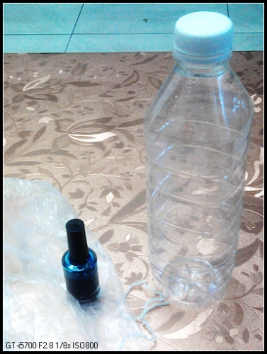 材料:一只饮料瓶(大一些、透明度高一些的为佳),一只塑料袋,色素(蓝色的海,如果喜欢别的颜色也可以),剪刀和一小段绳子。