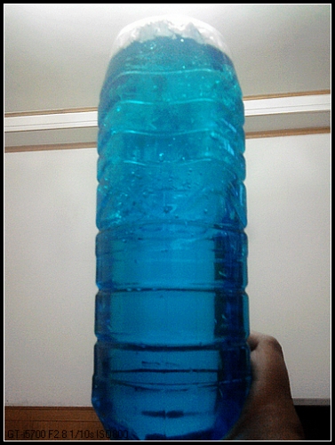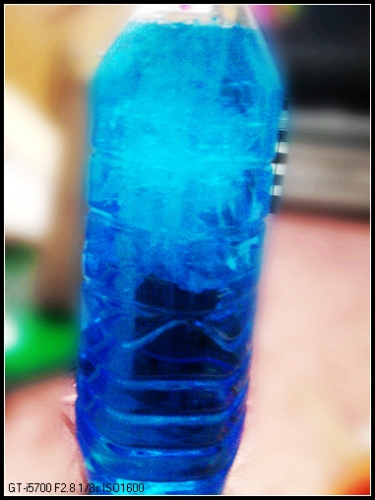 3.瓶子里装水,滴入蓝色颜料(一滴就够了,淡淡的颜色能观察出效果,太深了就看不清楚了,我只放了一滴,也觉得够深了);