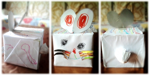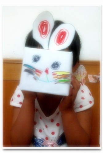 我糊好了纸盒子,婷动手画,耳朵和胡子是用白纸贴在快递袋子上然后剪下来。