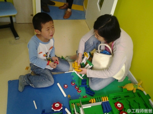 这是力学和机械组。工程师爸爸站在一边看着工程师妹妹组装机械机器人。爱就是陪伴提示,不代替孩子思考,让孩子自己成长。