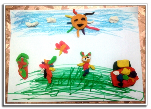 很漂亮的画面,可是再黑背景上太枯燥了。我取了张白纸,你可以画上蓝天和草地吗?当然可以!婷刷刷几笔描绘出背景,还问,妈妈,你见过这么高的草吗?它们很茂盛吧!然后把橡皮泥作品一样一样摆上去,很立体很漂亮的效果啊!给宝儿记录一下。