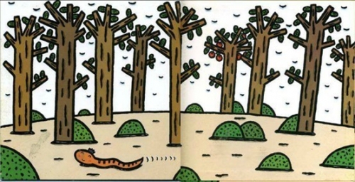 前后环衬也在讲故事,是故事的一部分。小蛇死了吗?是的,小蛇没有死,答案就在后环衬里。因为那棵苹果树不见了!