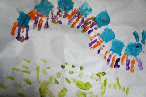 宝宝的小手指涂上颜色就变成了毛毛虫的脚丫