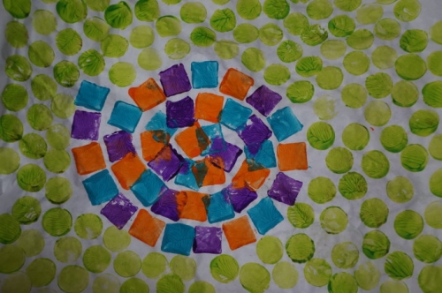 作品二:荷花叶上的蜗牛壳(该作品由妈妈完成。宝宝创作毛毛虫剩下不少颜料,我怕浪费了,临时创意一个蜗牛壳。因为宝宝对这个东西实在太有兴趣了,在北大的校园里找到好几个:水池里、荷叶上、土地里)