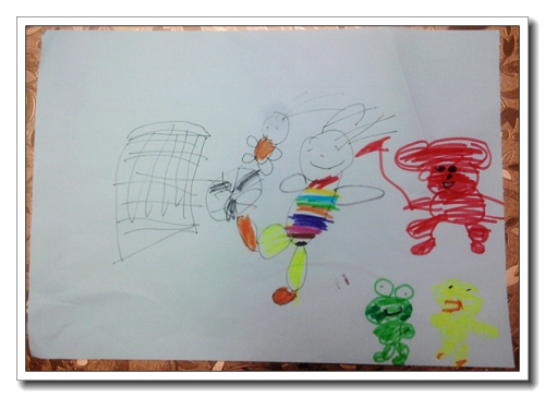 下班回家,看到了婷的作品,眼前一亮。球门是网状的,足球是黑色和白色组成,一只小兔子飞起腿来踢球,另一只小兔子赶着去拦截。旁边当裁判和观众的是红袋鼠、跳跳蛙和火帽子——幼儿画报里面的3位小主人公,跳跳蛙最像,火帽子也有点像,摇着红旗的那个红袋鼠嘛,是红色滴,是大耳朵,我却真没认出它来,呃,不过,其实,让我画也好不到哪里去。