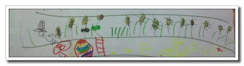 (其实这幅画上当时有大量的信息,比如下面这块黄色的看不清楚的部分,是一只小兔子生病了,躺在手推车上,兔子医生送它去看病。它的朋友爬上梯子,翻过彩色的大石头,找人去了。)