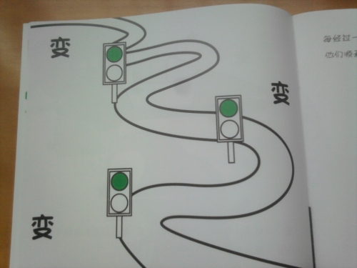 买回了《菲利的颜色魔法》,讲到绿色那一本的时候,其中有一页是一路绿灯,婷立刻大叫:“画错了,绿灯应该在下面!”想想,貌似是啊。