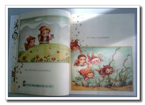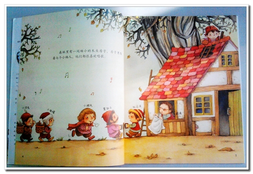 画风我也很喜欢,柔和的色调,一点也不刺眼。七个小矮人各有特色,看看第一页,他们可爱的名字就能分辨出来。