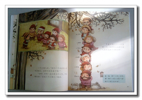 再次,是小矮人们的团结协作——一个小矮人够不到树叶,大家一起合作,就能做到;还有小矮人们乐于助人的精神;