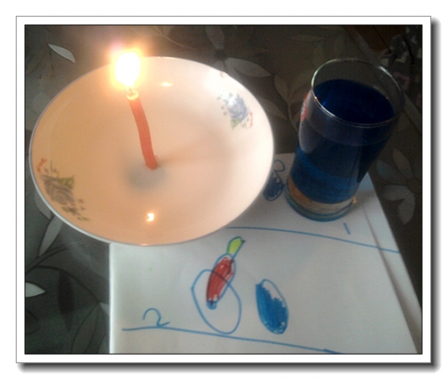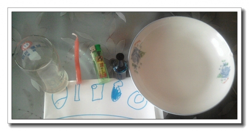也是网上学来的,实验材料超级简单。本来想找个破盘子、烂杯子,但有难度,然后确定了一下家里人不介意我往盘子里滴蜡烛和使用食用色素后,开始准备材料。提醒了一下婷做好实验记录,鉴于上次我对她实验记录的大力表扬,小家伙兴趣很高,立刻找来了纸和一堆彩色的笔。