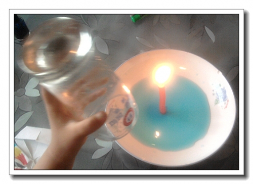 星期日下午要出门,时间不多。给婷冻了点里面有花花叶叶的冰块和彩色的形状冰块,时间还有。于是决定做杯中蜡烛这个实验。