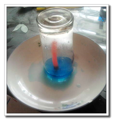 原理:杯子是空的,但里面有空气,蜡烛燃烧氧气,氧气耗完,蜡烛熄灭,杯中气压变小,水位上升。