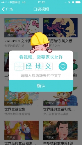 “口袋视频”为了不让小朋友们随便看动画片,在视频播放页面加了填写成语故事锁哦。