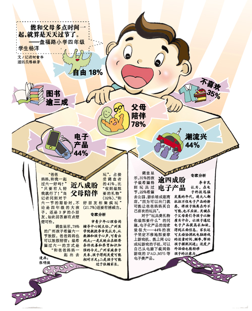 调查显示,78%的广州孩子希望六一节放假,爸爸妈妈也可以放假陪着;最希望过六一的方式是“和爸爸妈妈一起出去玩”,占接受调查者的41%,比“收到最想要的礼物”(32%)、“和好朋友相聚疯玩”(21.7%)还要有诱惑力。