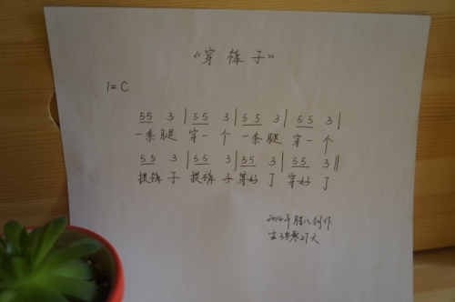 第三首歌曲是腊八那天某天下午儿子睡觉起来我陪他一起穿衣服在他自己提裤子的时候突然他唱起歌来整个曲子只有“3”和“5”两个音歌词和曲调都很简单但很上口之所以只有两个音也许是受到奥尔夫的“五音旋律”的影响2个多月前我带宝唱了4首奥尔夫音乐里非常非常简单的“五音歌曲”有些的确简单到只有“3”和“5”两个音但正是这样的音乐非常适合小宝宝![]()
